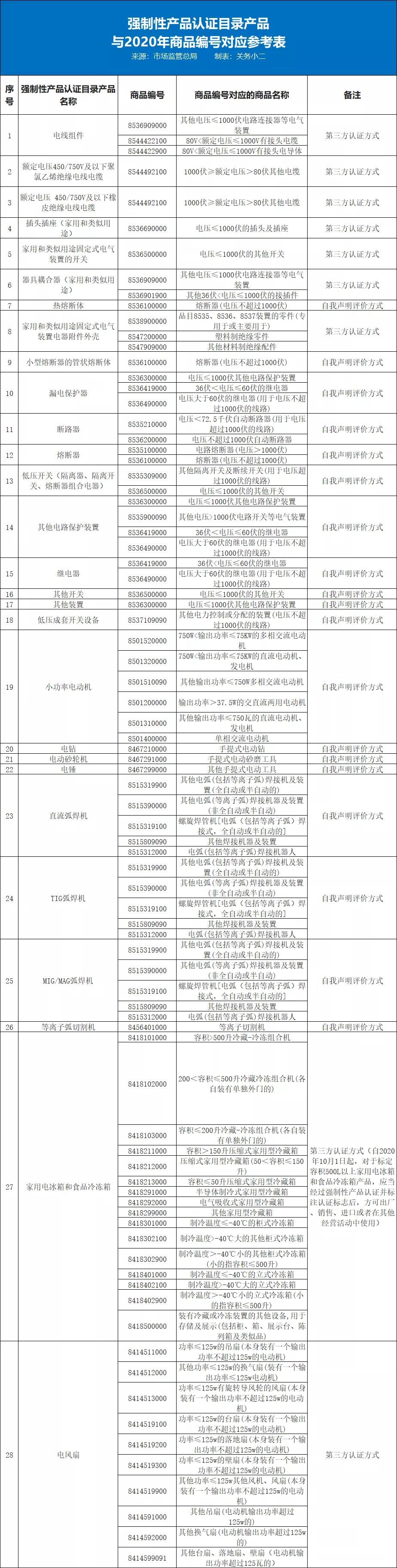 強制性產品認證目錄產品與2020年商品編號對應參考表