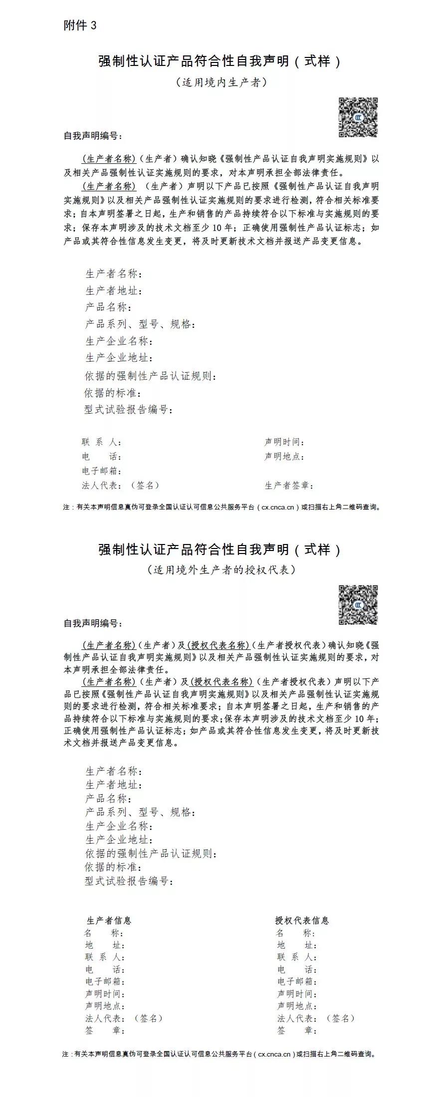 適用強制性產品認證自我聲明評價方式的產品,只能采用自我聲明評價方式,不再發放強制性產品認證證書。企業應依據《強制性產品認證自我聲明實施規則》要求完成自我評價,在“自我聲明符合性信息報送系統”(http://sdoc.cnca.cn)報送產品符合性信息,并對產品加施強制性產品認證標志后,方可出廠、銷售、進口或者在其他經營活動中使用。產品符合性信息報送成功后,系統生成“強制性認證產品符合性自我聲明”(式樣見附件3)視同獲得強制性產品認證證書,后續監督管理要求相同。