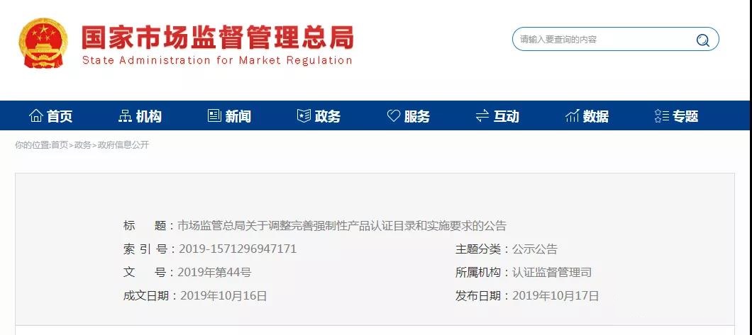 10月17日,市場監管總局發布關于調整完善強制性產品認證目錄和實施要求的公告,對強制性產品認證目錄和實施要求進行了調整: