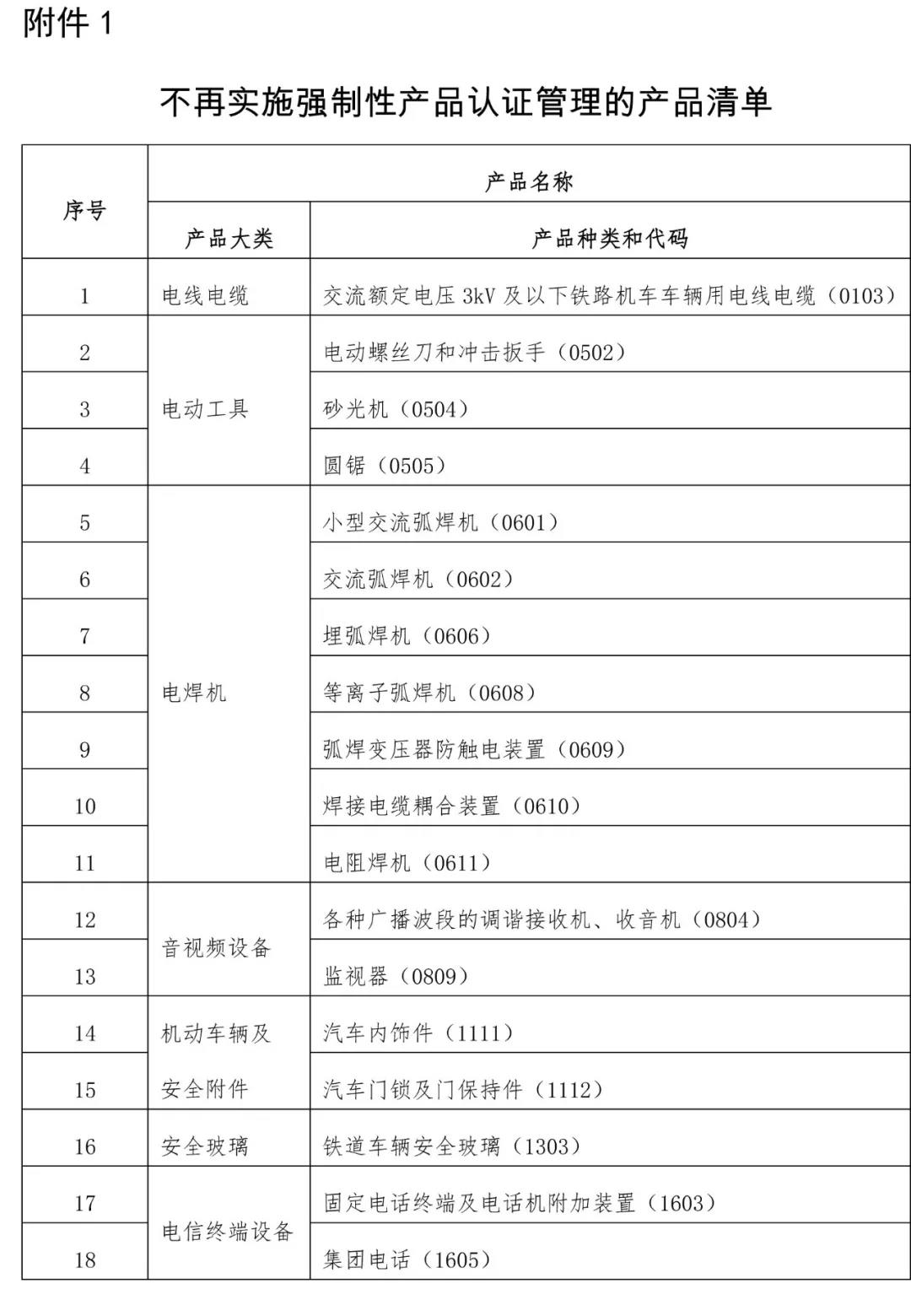 附件:1. 不再實施強制性產品認證管理的產品清單