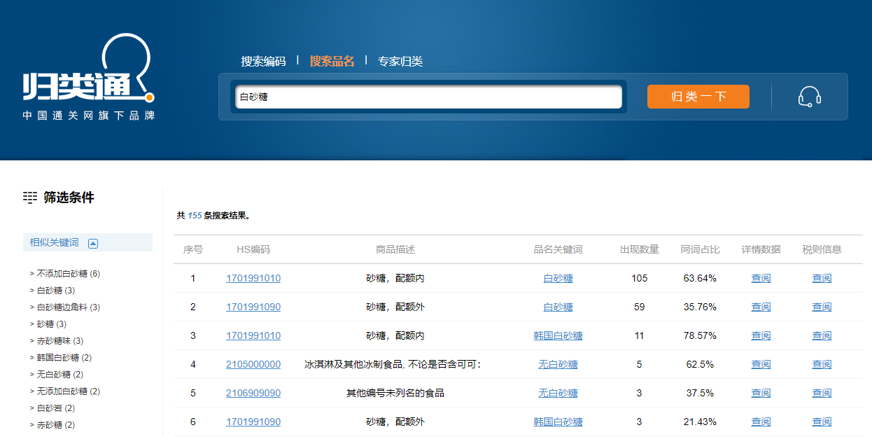 例如搜索白砂糖,就會出現HS編碼,海關稅金,一般都是根據百分比計算,按貨值*百分比即可確認到不同產品的稅金。